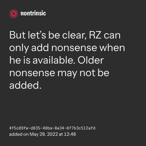 поделитьсяBut let’s be clear, RZ can only add nonsense when he is available. Older nonsense may not be added.