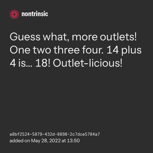 поделитьсяGuess what, more outlets! One two three four. 14 plus 4 is… 18! Outlet-licious!