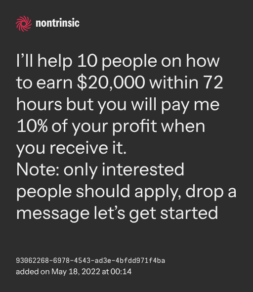 поделитьсяI’ll help 10 people on how to earn $20,000 within 72 hours but you will pay me 10% of your profit when you receive it.
