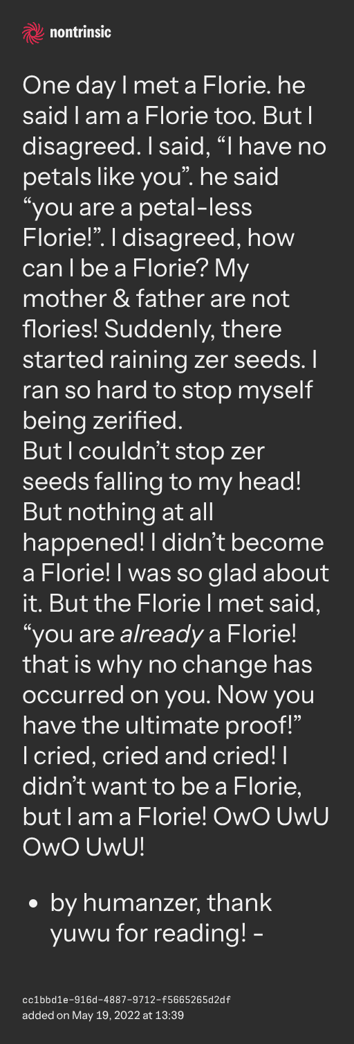поделитьсяOne day I met a Florie. he said I am a Florie too. But I disagreed. I said, “I have no petals like you”. he said “you are a petal-less Florie!”. I disagreed, how can I be a Florie? My mother & father are not flories! Suddenly, there started raining zer seeds. I ran so hard to stop myself being zerified.