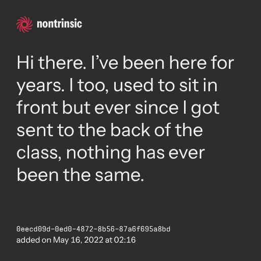 поделитьсяHi there. I’ve been here for years. I too, used to sit in front but ever since I got sent to the back of the class, nothing has ever been the same.