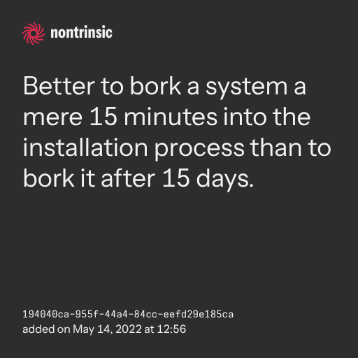 поделитьсяBetter to bork a system a mere 15 minutes into the installation process than to bork it after 15 days.