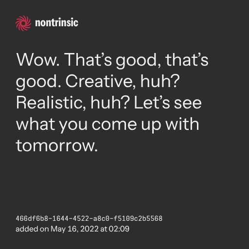 поделитьсяWow. That’s good, that’s good. Creative, huh? Realistic, huh? Let’s see what you come up with tomorrow.