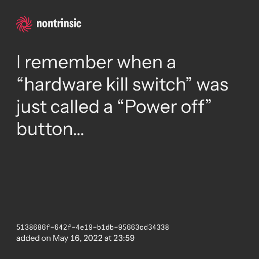 поделитьсяI remember when a “hardware kill switch” was just called a “Power off” button…