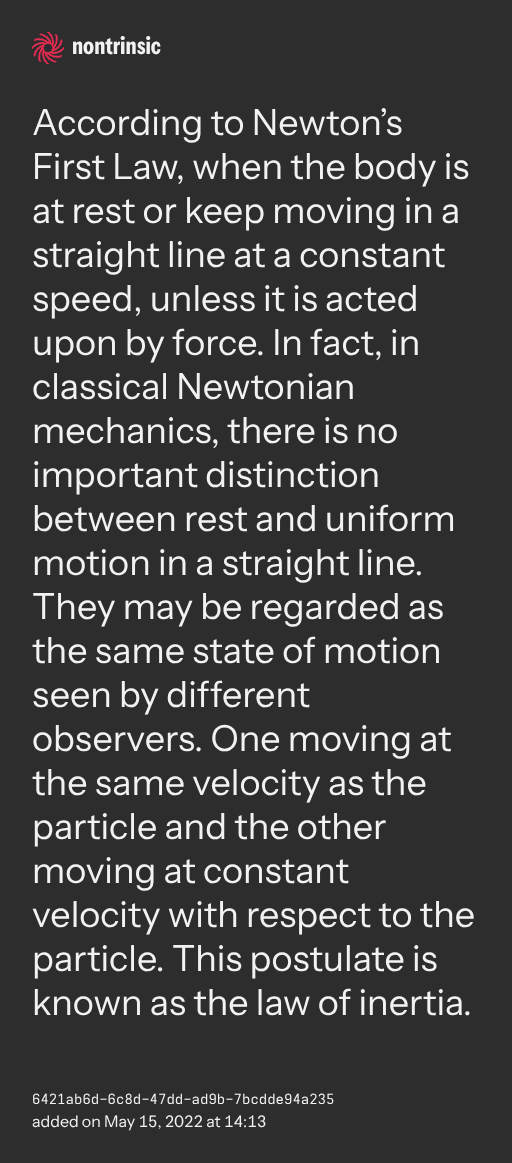 поделитьсяAccording to Newton’s First Law, when the body is at rest or keep moving in a straight line at a constant speed, unless it is acted upon by force. In fact, in classical Newtonian mechanics, there is no important distinction between rest and uniform motion in a straight line. They may be regarded as the same state of motion seen by different observers. One moving at the same velocity as the particle and the other moving at constant velocity with respect to the particle. This postulate is known as the law of inertia.