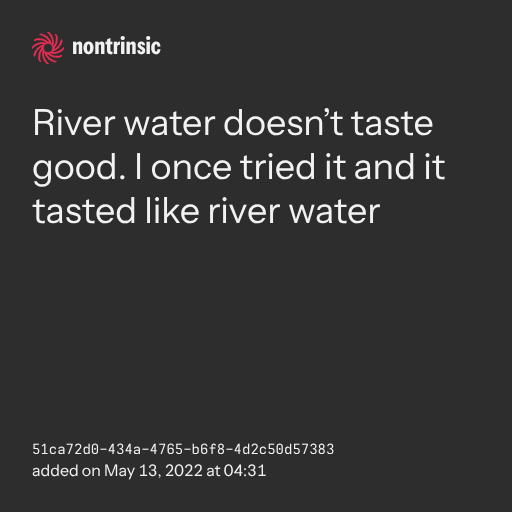 поделитьсяRiver water doesn’t taste good. I once tried it and it tasted like river water