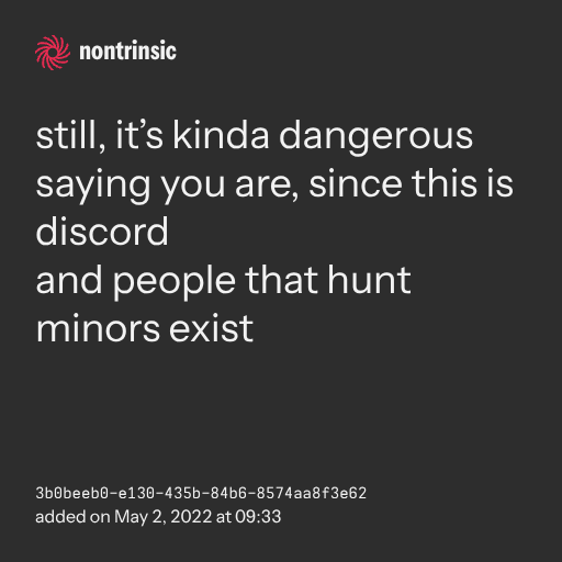 поделитьсяstill, it’s kinda dangerous saying you are, since this is discord