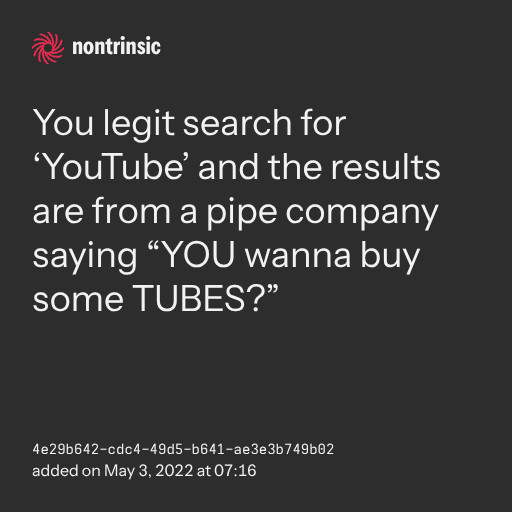 поделитьсяYou legit search for ‘YouTube’ and the results are from a pipe company saying “YOU wanna buy some TUBES?”