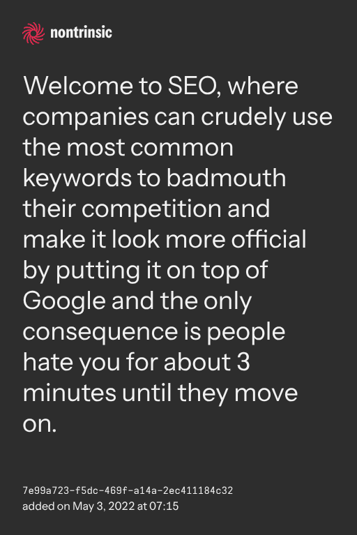 поделитьсяWelcome to SEO, where companies can crudely use the most common keywords to badmouth their competition and make it look more official by putting it on top of Google and the only consequence is people hate you for about 3 minutes until they move on.