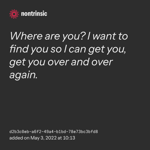 поделитьсяWhere are you? I want to find you so I can get you, get you over and over again.