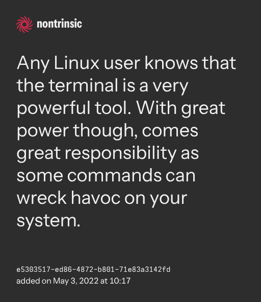 поделитьсяAny Linux user knows that the terminal is a very powerful tool. With great power though, comes great responsibility as some commands can wreck havoc on your system.