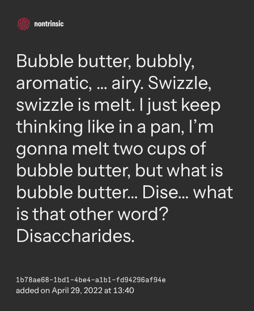Bubble butter, bubbly, aromatic, … airy. Swizzle, swizzle is melt. I just keep thinking like in a pan, I’m gonna melt two cups of bubble butter, but what is bubble butter… Dise… what is that other word? Disaccharides.