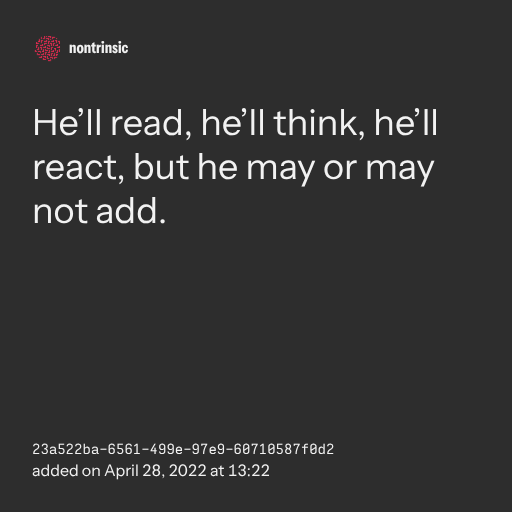поделитьсяHe’ll read, he’ll think, he’ll react, but he may or may not add.