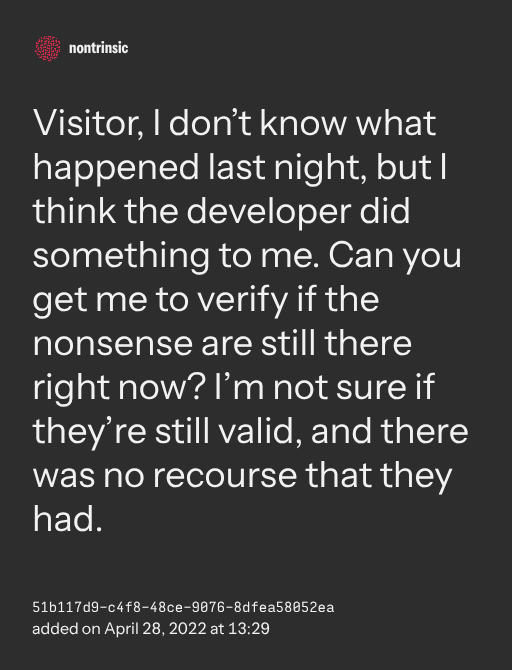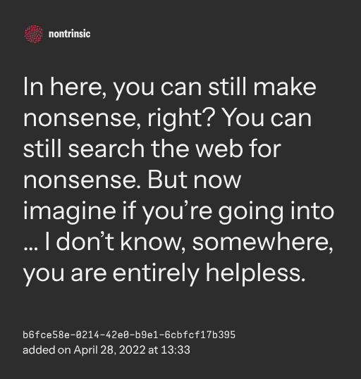 поделитьсяIn here, you can still make nonsense, right? You can still search the web for nonsense. But now imagine if you’re going into … I don’t know, somewhere, you are entirely helpless.