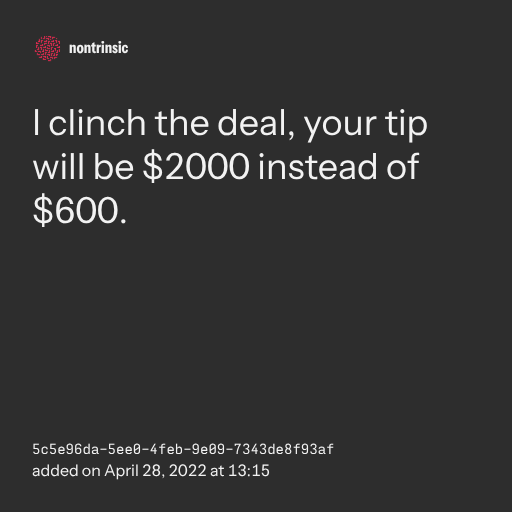 поделитьсяI clinch the deal, your tip will be $2000 instead of $600.