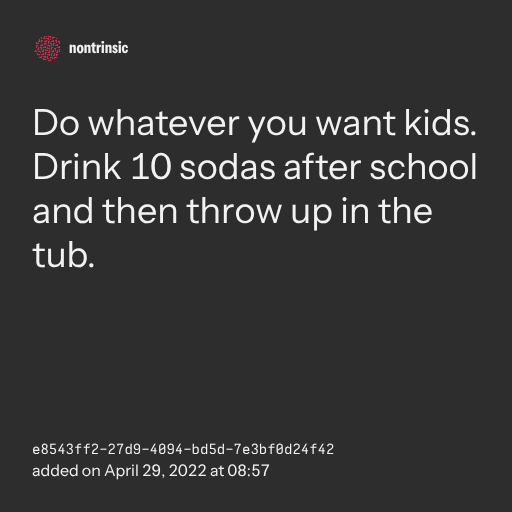 поделитьсяDo whatever you want kids. Drink 10 sodas after school and then throw up in the tub.
