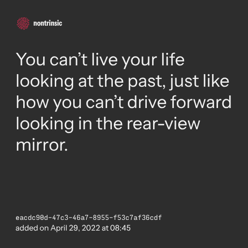 поделитьсяYou can’t live your life looking at the past, just like how you can’t drive forward looking in the rear-view mirror.