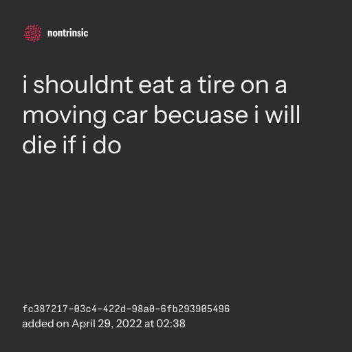поделитьсяi shouldnt eat a tire on a moving car becuase i will die if i do
