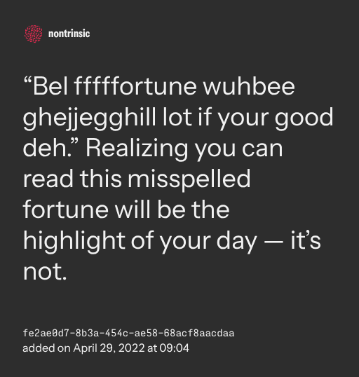 поделиться“Bel fffffortune wuhbee ghejjegghill lot if your good deh.” Realizing you can read this misspelled fortune will be the highlight of your day — it’s not.