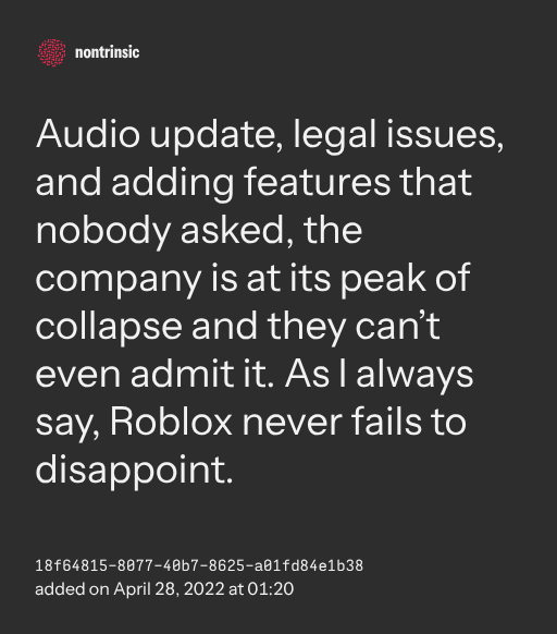 поделитьсяAudio update, legal issues, and adding features that nobody asked, the company is at its peak of collapse and they can’t even admit it. As I always say, Roblox never fails to disappoint.