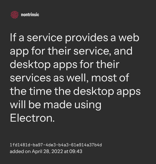поделитьсяIf a service provides a web app for their service, and desktop apps for their services as well, most of the time the desktop apps will be made using Electron.