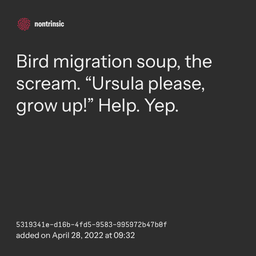 поделитьсяBird migration soup, the scream. “Ursula please, grow up!” Help. Yep.