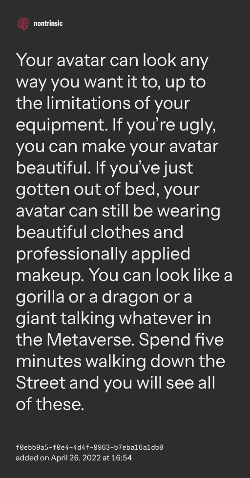 Your avatar can look any way you want it to, up to the limitations of your equipment. If you’re ugly, you can make your avatar beautiful. If you’ve just gotten out of bed, your avatar can still be wearing beautiful clothes and professionally applied makeup. You can look like a gorilla or a dragon or a giant talking whatever in the Metaverse. Spend five minutes walking down the Street and you will see all of these.