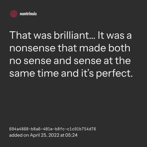 поделитьсяThat was brilliant… It was a nonsense that made both no sense and sense at the same time and it’s perfect.