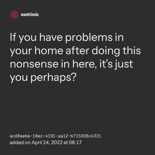 поделитьсяIf you have problems in your home after doing this nonsense in here, it’s just you perhaps?