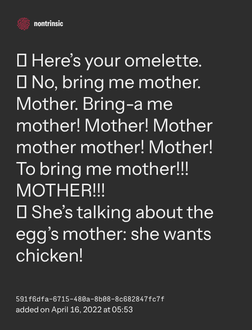 ● No, bring me mother. Mother. Bring-a me mother! Mother! Mother mother mother! Mother! To bring me mother!!! MOTHER!!!