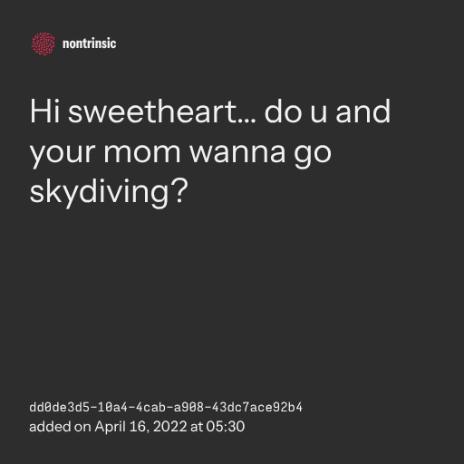 поделитьсяHi sweetheart… do u and your mom wanna go skydiving?