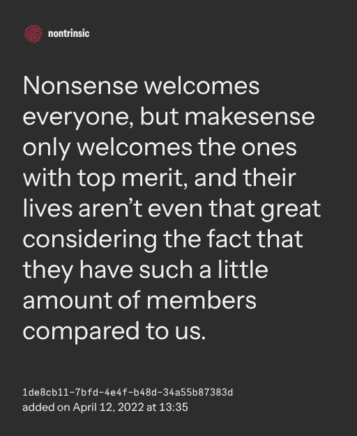 поделитьсяNonsense welcomes everyone, but makesense only welcomes the ones with top merit, and their lives aren’t even that great considering the fact that they have such a little amount of members compared to us.