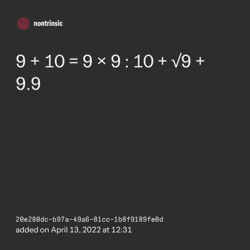 поделиться9 + 10 = 9 × 9 : 10 + √9 + 9.9