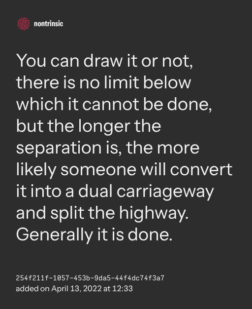 поделитьсяYou can draw it or not, there is no limit below which it cannot be done, but the longer the separation is, the more likely someone will convert it into a dual carriageway and split the highway. Generally it is done.