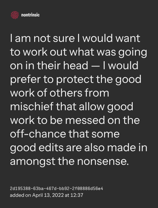 поделитьсяI am not sure I would want to work out what was going on in their head — I would prefer to protect the good work of others from mischief that allow good work to be messed on the off-chance that some good edits are also made in amongst the nonsense.