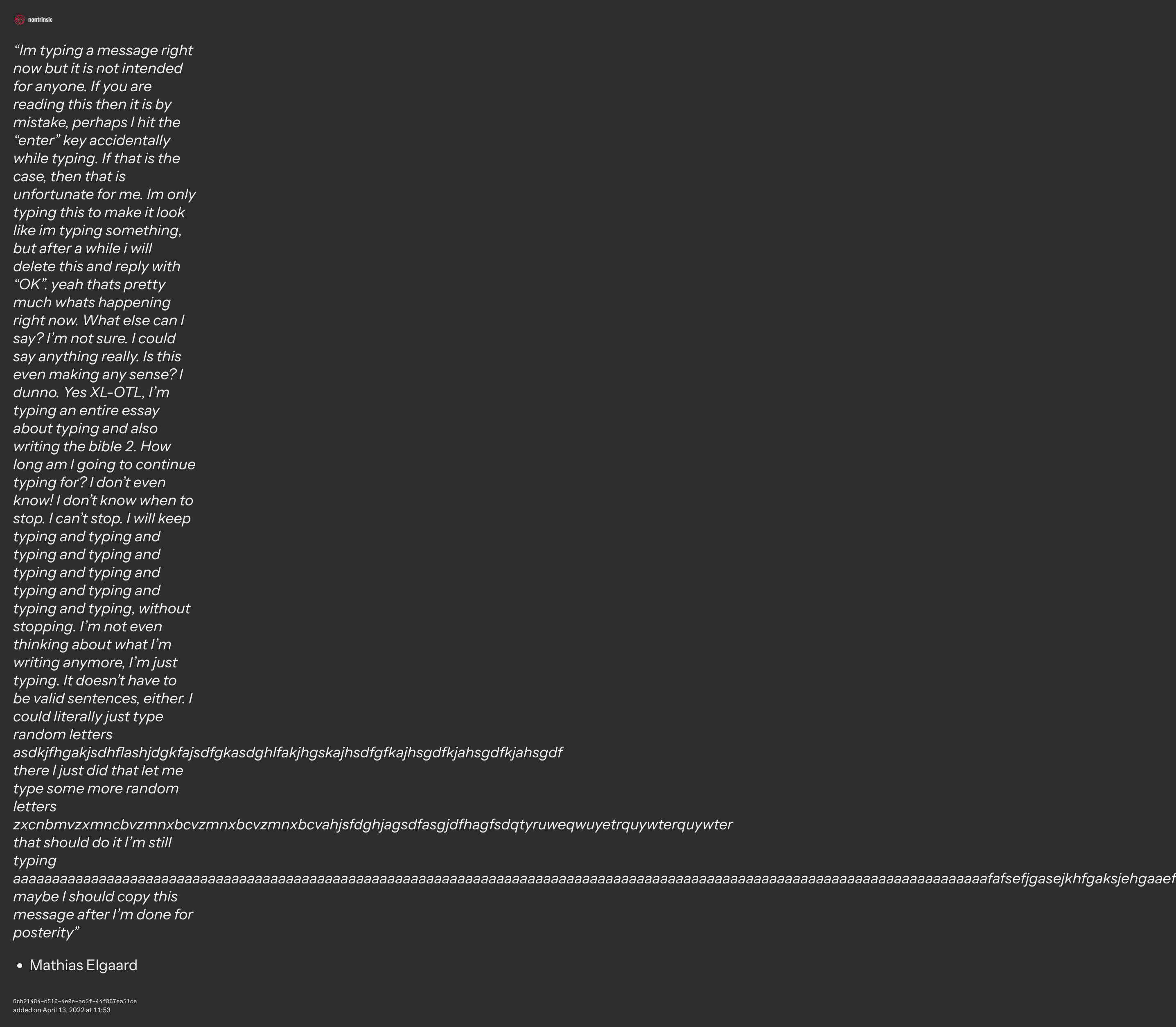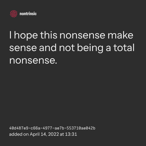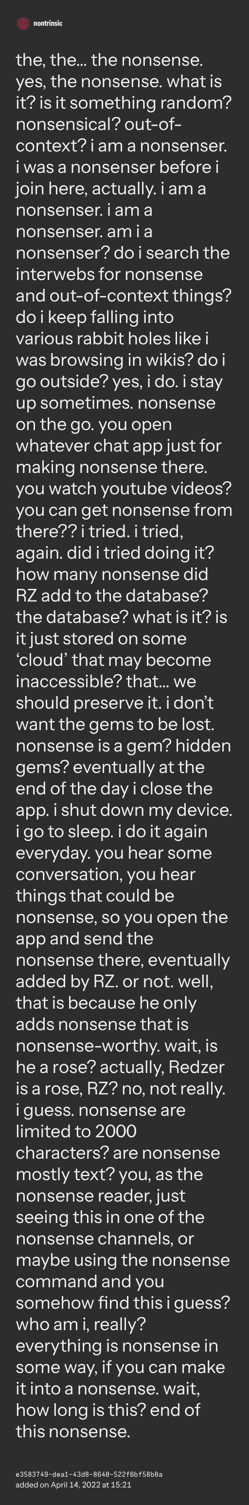 поделитьсяthe, the… the nonsense. yes, the nonsense. what is it? is it something random? nonsensical? out-of-context? i am a nonsenser. i was a nonsenser before i join here, actually. i am a nonsenser. i am a nonsenser. am i a nonsenser? do i search the interwebs for nonsense and out-of-context things? do i keep falling into various rabbit holes like i was browsing in wikis? do i go outside? yes, i do. i stay up sometimes. nonsense on the go. you open whatever chat app just for making nonsense there. you watch youtube videos? you can get nonsense from there?? i tried. i tried, again. did i tried doing it? how many nonsense did RZ add to the database? the database? what is it? is it just stored on some ‘cloud’ that may become inaccessible? that… we should preserve it. i don’t want the gems to be lost. nonsense is a gem? hidden gems? eventually at the end of the day i close the app. i shut down my device. i go to sleep. i do it again everyday. you hear some conversation, you hear things that could be nonsense, so you open the app and send the nonsense there, eventually added by RZ. or not. well, that is because he only adds nonsense that is nonsense-worthy. wait, is he a rose? actually, Redzer is a rose, RZ? no, not really. i guess. nonsense are limited to 2000 characters? are nonsense mostly text? you, as the nonsense reader, just seeing this in one of the nonsense channels, or maybe using the nonsense command and you somehow find this i guess? who am i, really? everything is nonsense in some way, if you can make it into a nonsense. wait, how long is this? end of this nonsense.