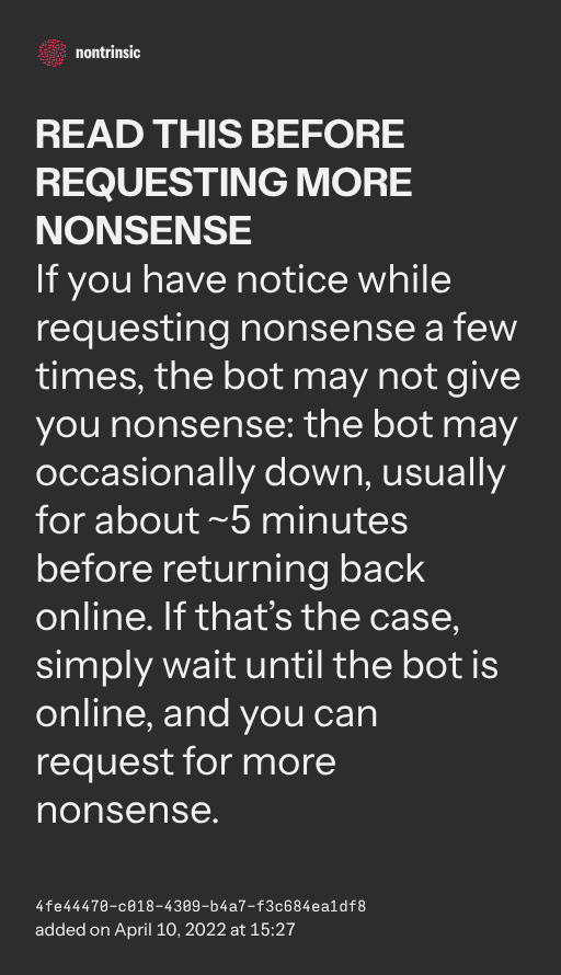 If you have notice while requesting nonsense a few times, the bot may not give you nonsense: the bot may occasionally down, usually for about ~5 minutes before returning back online. If that’s the case, simply wait until the bot is online, and you can request for more nonsense.