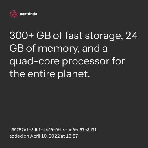 поделиться300+ GB of fast storage, 24 GB of memory, and a quad-core processor for the entire planet.