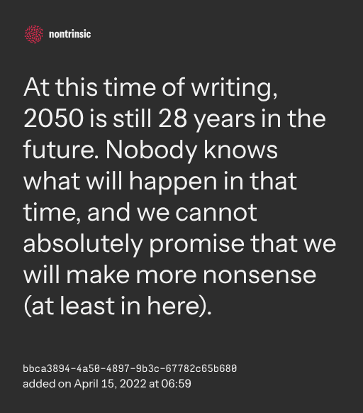 At this time of writing, 2050 is still 28 years in the future. Nobody knows what will happen in that time, and we cannot absolutely promise that we will make more nonsense (at least in here).