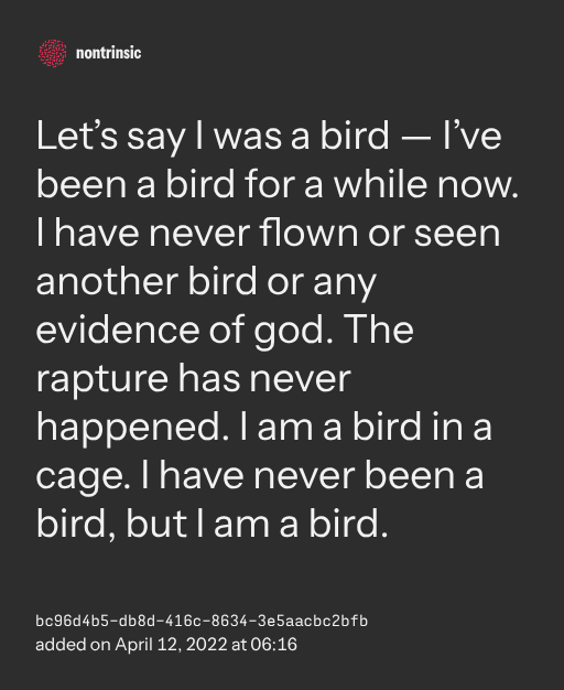 поделитьсяLet’s say I was a bird — I’ve been a bird for a while now. I have never flown or seen another bird or any evidence of god. The rapture has never happened. I am a bird in a cage. I have never been a bird, but I am a bird.