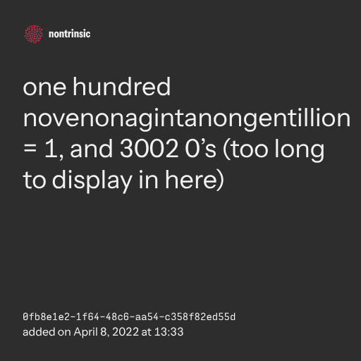 поделитьсяone hundred novenonagintanongentillion = 1, and 3002 0’s (too long to display in here)