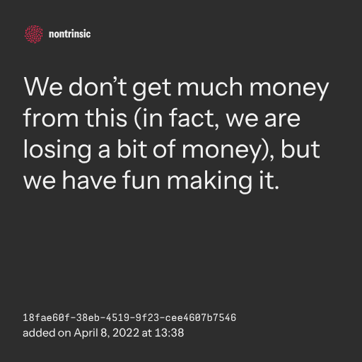 поделитьсяWe don’t get much money from this (in fact, we are losing a bit of money), but we have fun making it.