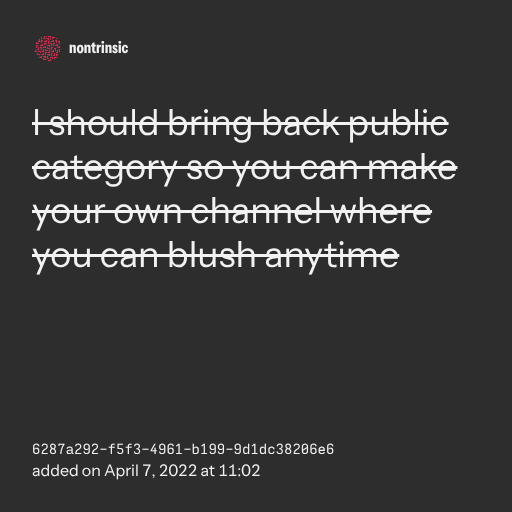 поделитьсяI should bring back public category so you can make your own channel where you can blush anytime