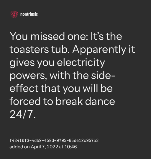 поделитьсяYou missed one: It’s the toasters tub. Apparently it gives you electricity powers, with the side-effect that you will be forced to break dance 24/7.