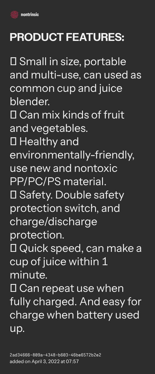 ● Small in size, portable and multi-use, can used as common cup and juice blender.