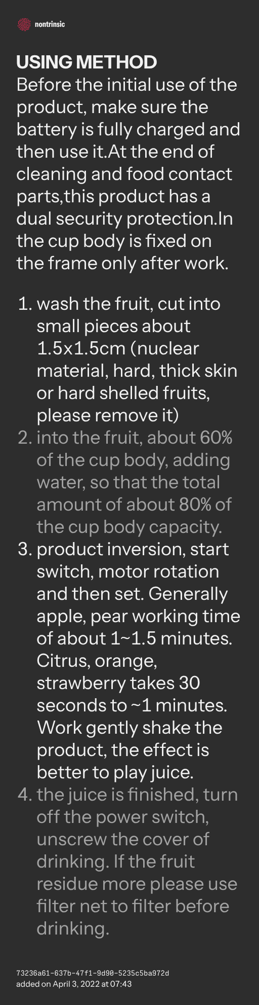 - product inversion, start switch, motor rotation and then set. Generally apple, pear working time of about 1~1.5 minutes. Citrus, orange, strawberry takes 30 seconds to ~1 minutes. Work gently shake the product, the effect is better to play juice.