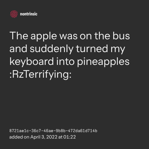 поделитьсяThe apple was on the bus and suddenly turned my keyboard into pineapples :RzTerrifying: