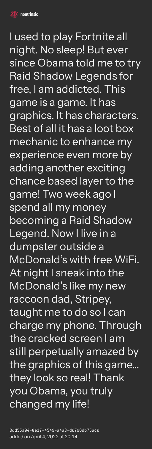 поделитьсяI used to play Fortnite all night. No sleep! But ever since Obama told me to try Raid Shadow Legends for free, I am addicted. This game is a game. It has graphics. It has characters. Best of all it has a loot box mechanic to enhance my experience even more by adding another exciting chance based layer to the game! Two week ago I spend all my money becoming a Raid Shadow Legend. Now I live in a dumpster outside a McDonald’s with free WiFi. At night I sneak into the McDonald’s like my new raccoon dad, Stripey, taught me to do so I can charge my phone. Through the cracked screen I am still perpetually amazed by the graphics of this game… they look so real! Thank you Obama, you truly changed my life!