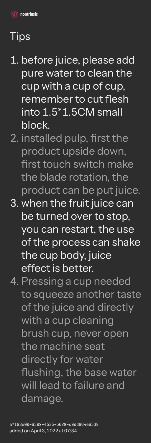 - when the fruit juice can be turned over to stop, you can restart, the use of the process can shake the cup body, juice effect is better.