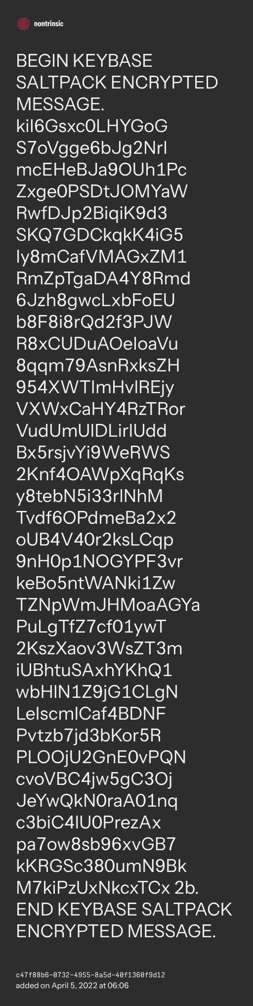 поделитьсяBEGIN KEYBASE SALTPACK ENCRYPTED MESSAGE. kiI6Gsxc0LHYGoG S7oVgge6bJg2NrI mcEHeBJa9OUh1Pc Zxge0PSDtJOMYaW RwfDJp2BiqiK9d3 SKQ7GDCkqkK4iG5 Iy8mCafVMAGxZM1 RmZpTgaDA4Y8Rmd 6Jzh8gwcLxbFoEU b8F8i8rQd2f3PJW R8xCUDuAOeIoaVu 8qqm79AsnRxksZH 954XWTImHvlREjy VXWxCaHY4RzTRor VudUmUlDLirlUdd Bx5rsjvYi9WeRWS 2Knf4OAWpXqRqKs y8tebN5i33rlNhM Tvdf6OPdmeBa2x2 oUB4V40r2ksLCqp 9nH0p1NOGYPF3vr keBo5ntWANki1Zw TZNpWmJHMoaAGYa PuLgTfZ7cf01ywT 2KszXaov3WsZT3m iUBhtuSAxhYKhQ1 wbHlN1Z9jG1CLgN LelscmlCaf4BDNF Pvtzb7jd3bKor5R PLOOjU2GnE0vPQN cvoVBC4jw5gC3Oj JeYwQkN0raA01nq c3biC4lU0PrezAx pa7ow8sb96xvGB7 kKRGSc380umN9Bk M7kiPzUxNkcxTCx 2b. END KEYBASE SALTPACK ENCRYPTED MESSAGE.